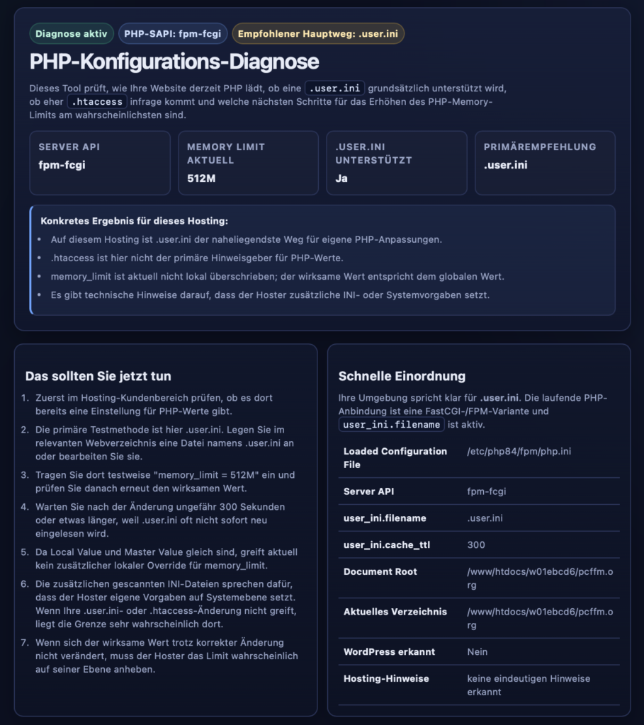 Dieses Tool dient ausschließlich der technischen Orientierung und ersetzt keine verbindliche Auskunft des Hosting-Anbieters. Trotz sorgfältiger Analyse kann die tatsächlich wirksame PHP-Konfiguration zusätzlich durch hosterseitige Vorgaben, Panel-Einstellungen, Pool-Konfigurationen oder andere serverseitige Mechanismen beeinflusst werden.