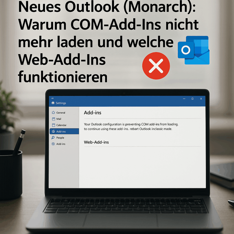 Nach dem Wechsel zum neuen Outlook (Projektname „Monarch“) fehlen vielen Anwendern ihre gewohnten Erweiterungen. Der Grund: Microsoft hat die klassische COM-Add-In-Technologie entfernt; das neue Outlook lädt nur noch Web-Add-Ins auf Basis von Office.js. Diese Add-Ins kommen über den Office Store oder werden zentral im Microsoft 365 Admin Center bereitgestellt. Ältere Erweiterungen für CRM, DMS oder E-Mail-Archivierung, die in der klassischen Windows-Variante liefen, erscheinen daher nicht mehr. Dieser Beitrag ordnet die technischen Unterschiede ein, zeigt konkrete Prüfschritte für Admins und skizziert sinnvolle Alternativen, bis Hersteller Web-Add-Ins liefern. Ein Hinweis vorweg: Es gibt bisher keinen verlässlichen Workaround für alte COM-Add-Ins.